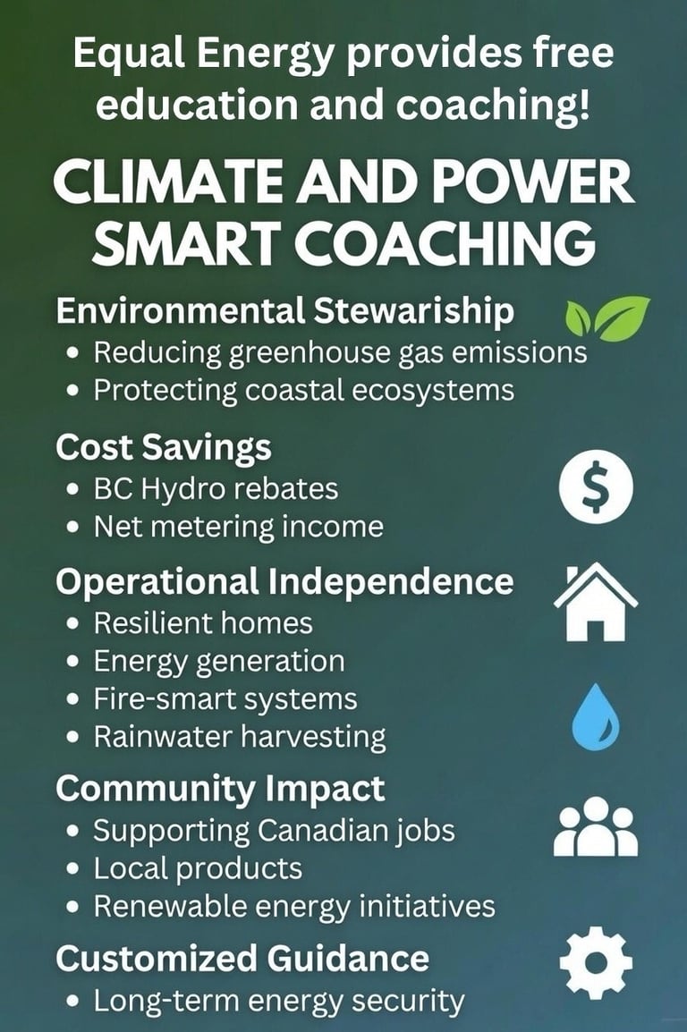 Through this coaching, Equal Energy LTD not only equips you with tools for power-smart living but also advances a greener, more resilient Canada. Contact us to begin your journey toward climate-smart energy independence